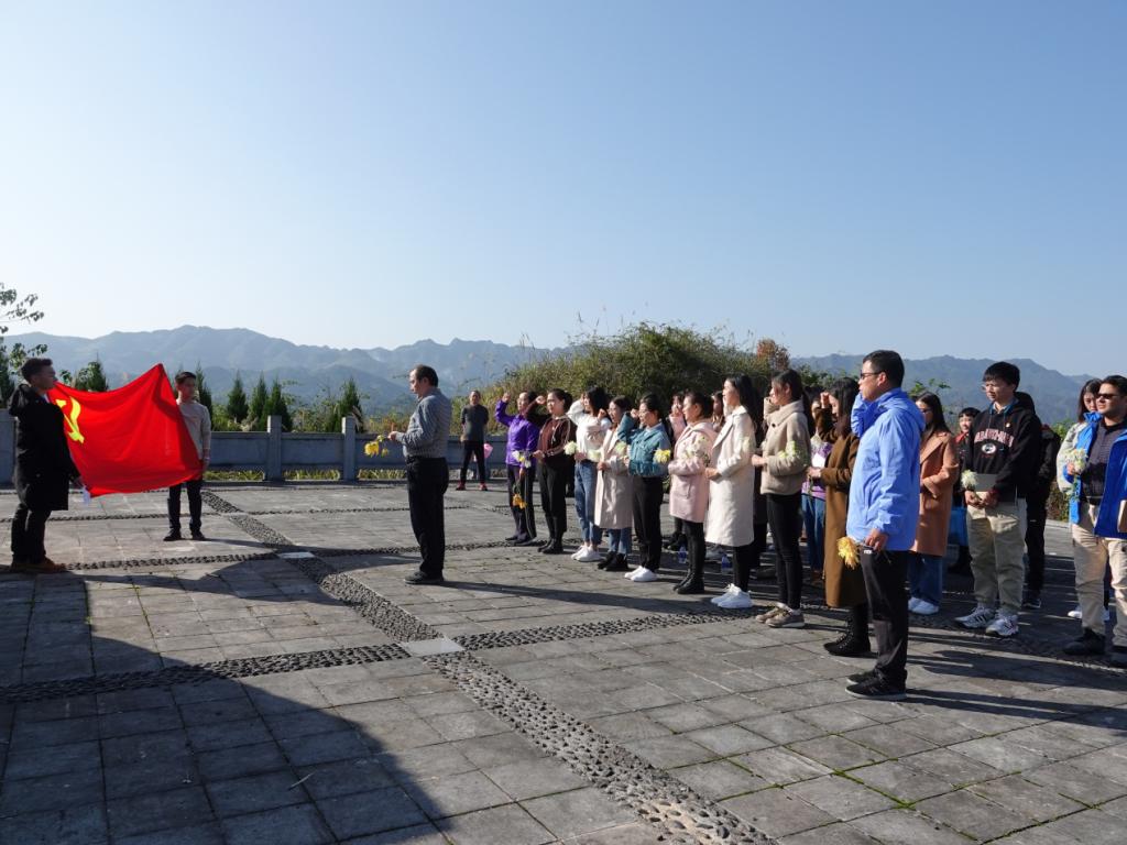 随后,吕萍经理一行带领研究生来到了永兴革命烈士陵园,遵义卉之丰现代农业有限公司总经理晁建强向同学们介绍,永兴革命烈士陵园是为纪念在剿匪战斗中牺牲的7位解放军烈士所建。1950年冬,盘踞在永兴周边的土匪残余势力,不甘心失败,纠集了上百人的队伍,裹挟着不明真相的农民,对驻守在永兴的30多位解放军进行了疯狂的进攻。在永兴保卫战中,解放军战士打退了土匪残余势力的多次进攻,坚守了一天一夜,最后在增援部队到达后,彻底消灭了这股土匪残余势力。在战斗中薛秀田、彭景应等7位解放军战士不幸壮烈牺牲。听完烈士们视死如归的沉痛故事,全体人员怀着庄严肃穆的心情在纪念碑前肃立默哀和三鞠躬,以此表达对烈士们崇高的敬意。通过祭扫陵园寄托哀思,缅怀革命先烈的不朽功绩,铭记他们的壮举。副经理王立伟带领全体党员面对党旗重温入党誓词,深刻表达了对党忠诚,为党的事业奋斗终身的决心。