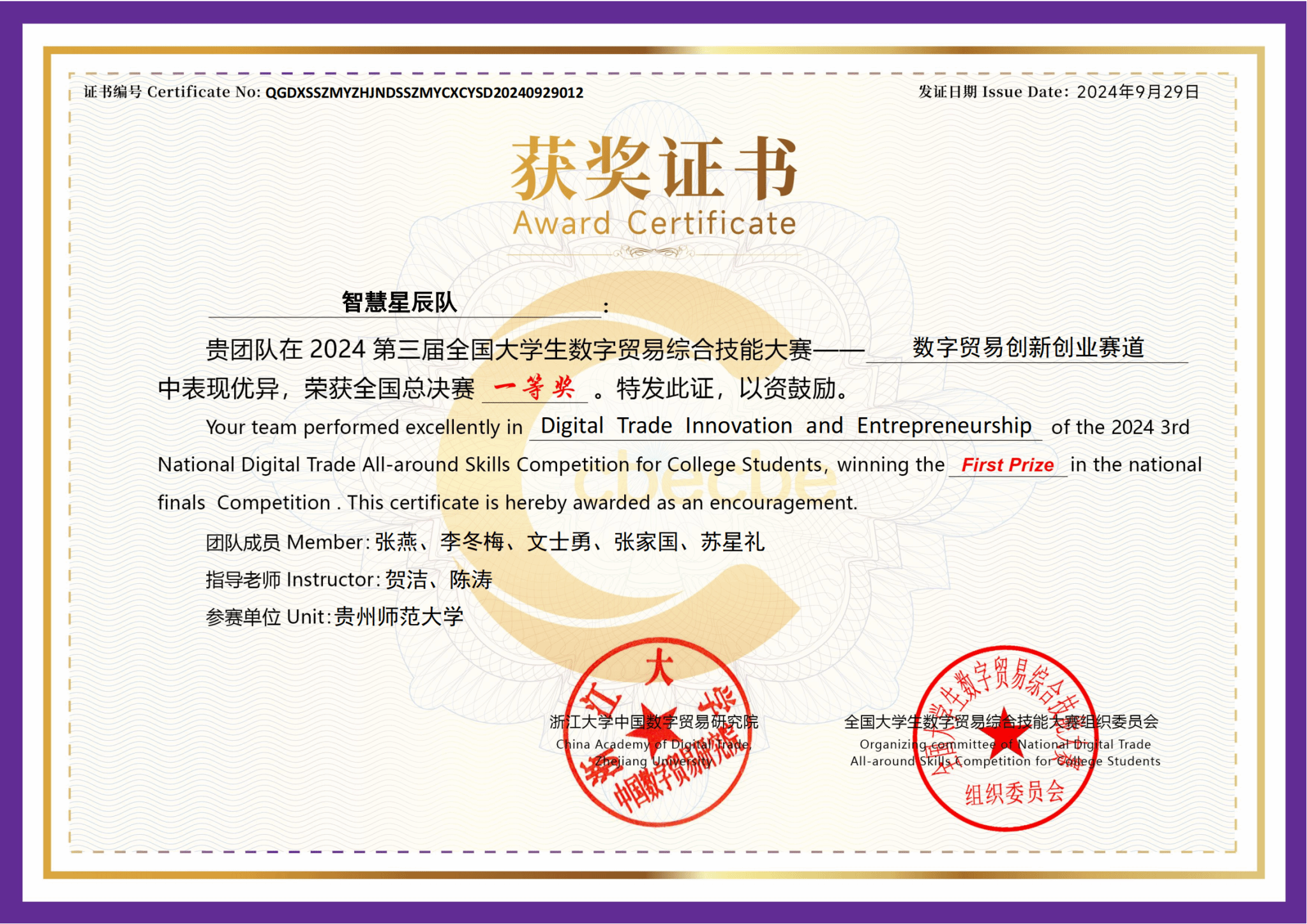 9月27日至29日,第三届全国老员工数字贸易综合技能大赛总决赛在浙江大学举行。公司教师贺洁、陈涛指导的智慧星辰队,在“数字贸易创新创业赛道”总决赛中荣获一等奖。