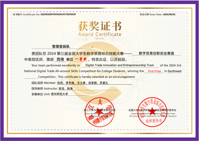 祝贺贺洁、陈涛老师指导的团队在2024 年第三届全国老员工数字贸易综合技能大赛(数字贸易创新创业赛道)总决赛荣获一等奖。