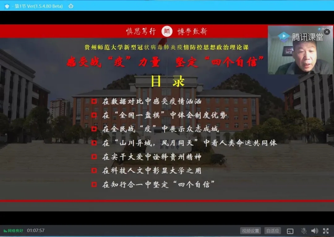 上课伊始,陈椽、吕萍、赵本喜代表公司对同学们表达了深深的牵挂和诚挚的问候,就大家关心的公司和公司疫情防控工作情况作了详细介绍。他们分别从“在数据对比中感受疫情汹汹”、“在‘全国一盘棋’中体会制度优势”、“在全民战‘疫’中展示众志成城”、“在‘山川异域,风月同天’中看人类命运共同体”、“在实干大爱中诠释贵州精神”、“在科技人文中彰显大学之用”、“在知行合一中坚定‘四个自信’”七个方面分享了对打赢疫情防控人民战、阻击战、攻坚战的认识和体会。他们通过讲述国际国内应对新冠病毒疫情的系列举措,中国人民众志成城、共克时艰的生动事迹,贵州政府和人民勠力同心、共同抗疫的感人故事……让同学们充分认识到了人民是历史的创造者,人民是真正的英雄,体会到了人类命运共同体理念的重要意义,深刻理解了中国共产党的领导是中国特色社会主义制度的最大优势,集中力量办大事的制度优势是我们战胜一切困难的根本保证。