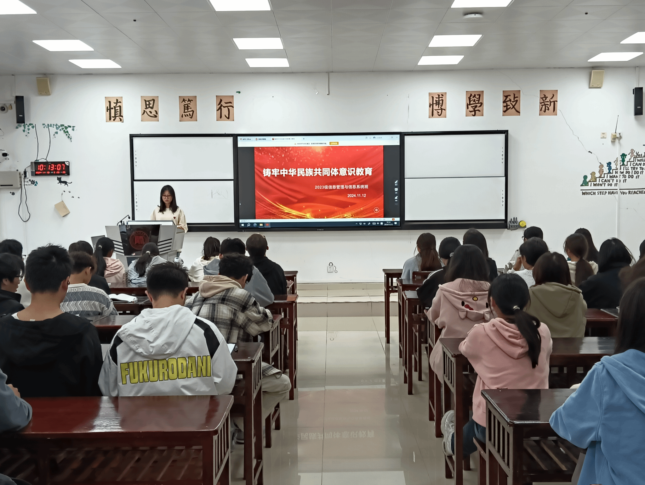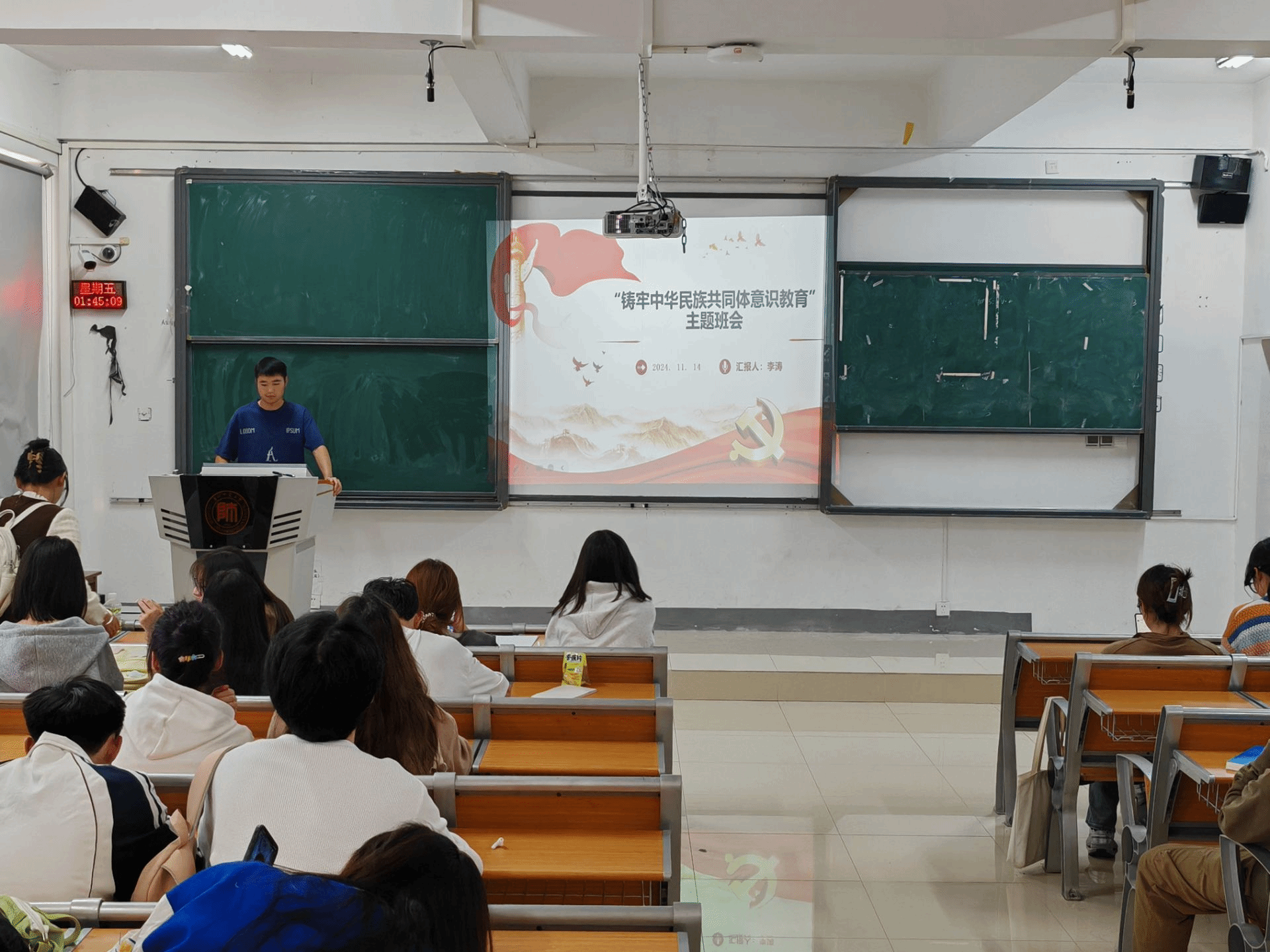 本次班会由各年级辅导员主持,各班班长主讲,公司全体员工参与。会上,各班利用PPT、视频等方式,从关于中华民族共同体、新时代铸牢中华民族共同体意识的行动指南、如何铸牢中华民族共同体意识三个方面,就中华民族共同体的提出和内涵结合生动的案例进行了详细的讲解,以此加深同学们对中华民族共同体意识的理解。此外,同学们还通过“铸牢中华民族共同体意识知识竞赛“的问答环节,了解了我国各民族在历史长河中相互交流、融合的历程,在轻松欢乐的氛围中体会到平等、团结、互助、和谐的社会主义民族关系。